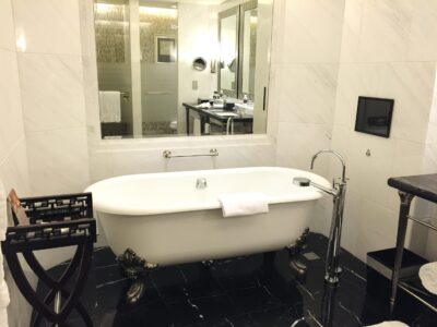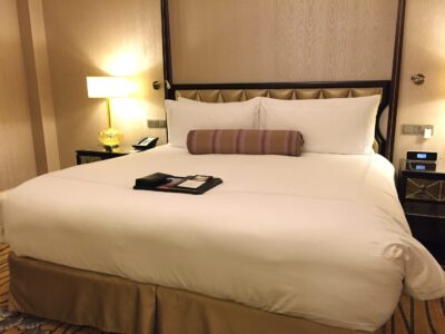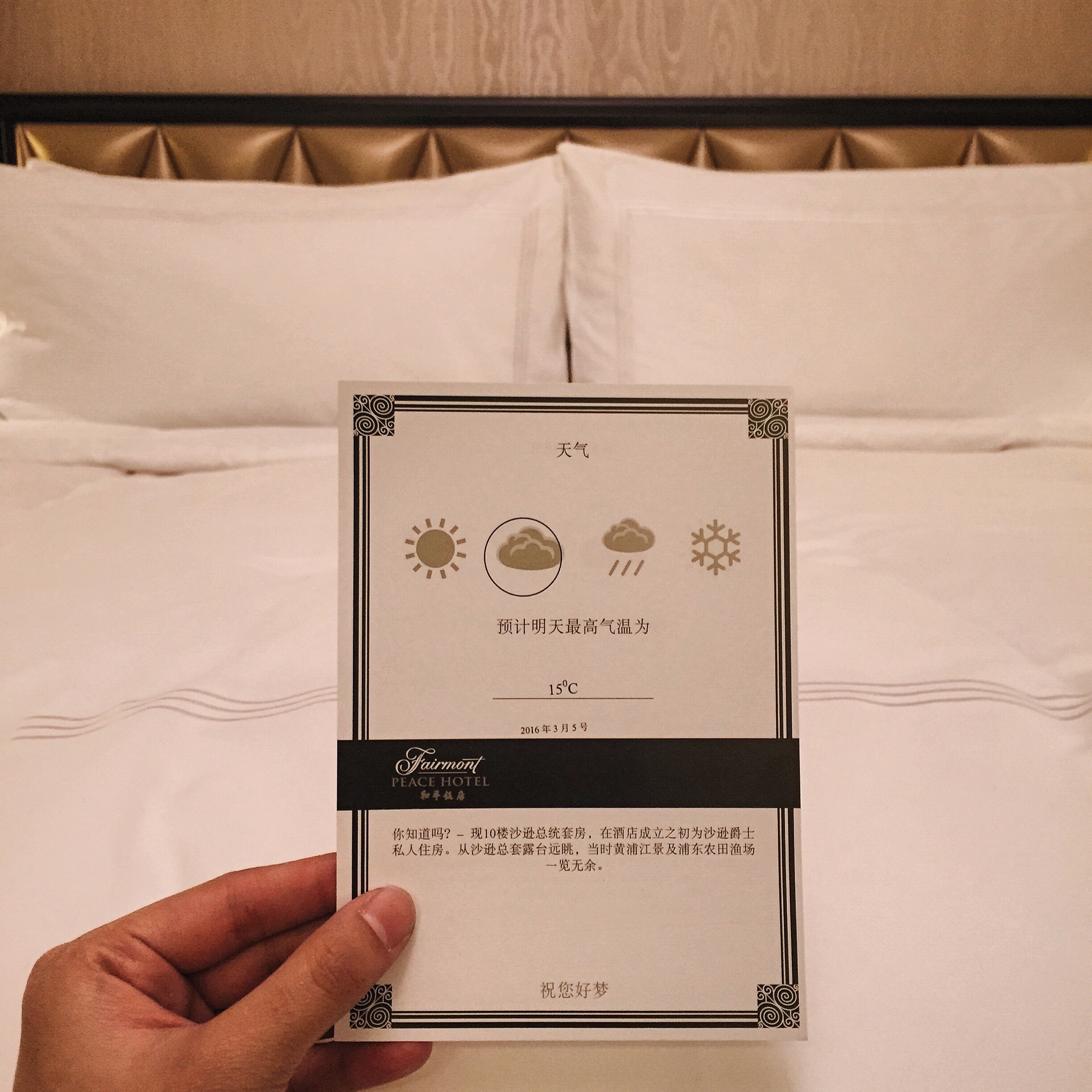 而和平飯店的衛浴備品是 Le Labo Rose 31,平靜、舒服,讓人感到特別放鬆。床上放著一張小卡,印著隔日的天氣與氣溫預測,