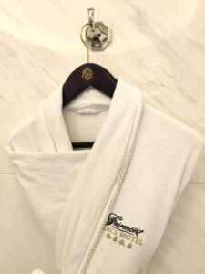 我特別喜歡那件掛在浴室牆上的浴袍,刺著「Fairmont Peace Hotel」的字樣,