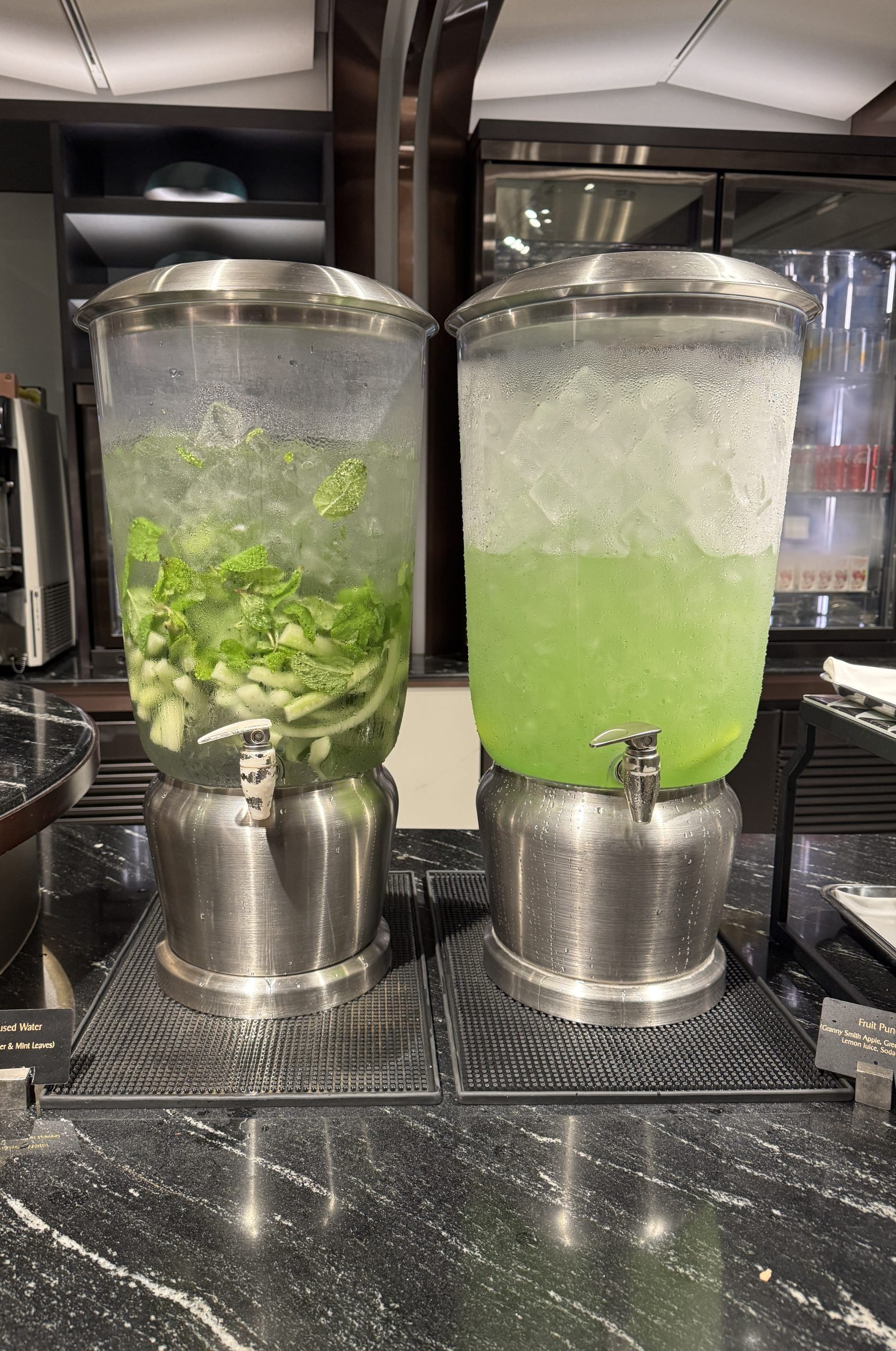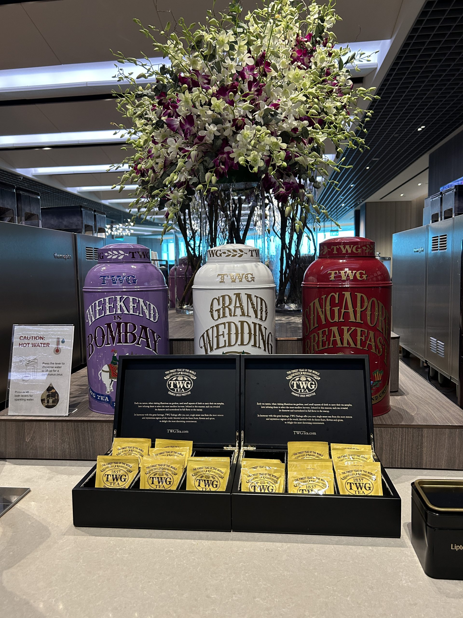 根本像是一家規模完整的 buffet 餐廳,讓人一直陷入選擇障礙。冷飲區除了基本的罐裝飲料、啤酒,熱飲還有新航經典的 TWG 茶包無限供應。