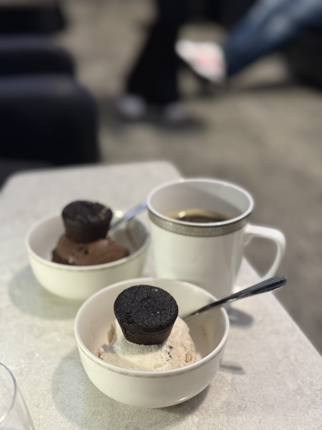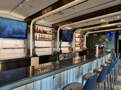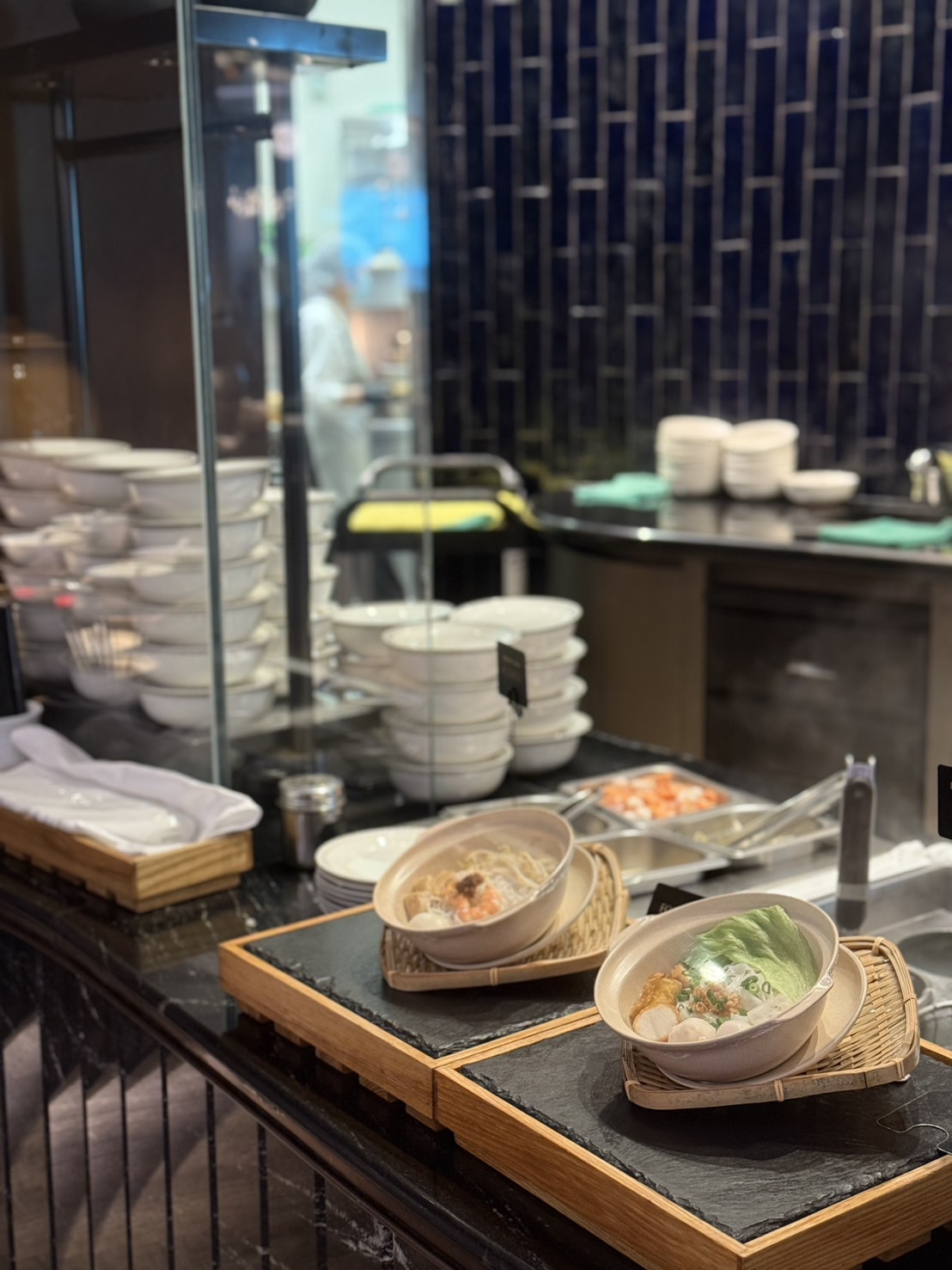 早上十點以前,貴賓室內有現煮咖啡吧台;下午五點半之後,會變成調酒吧。現煮麵食區會依照時段更換菜單,等於一天可以吃到三種不同的組合。