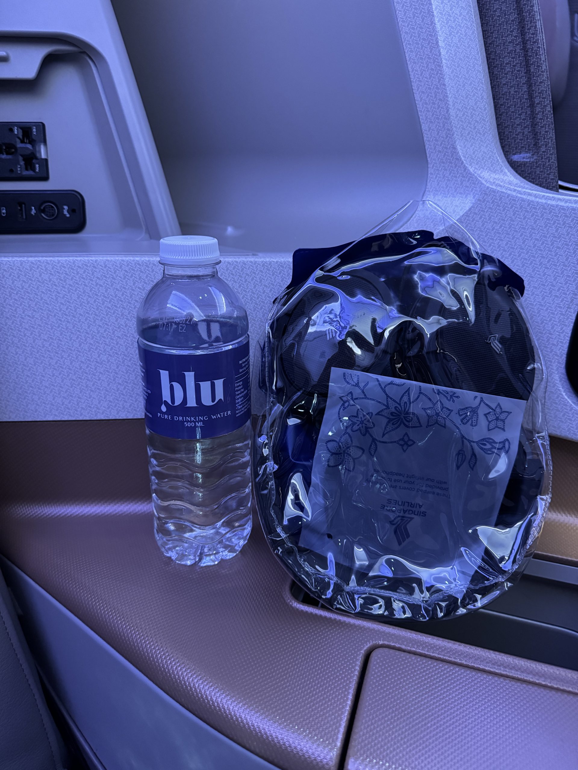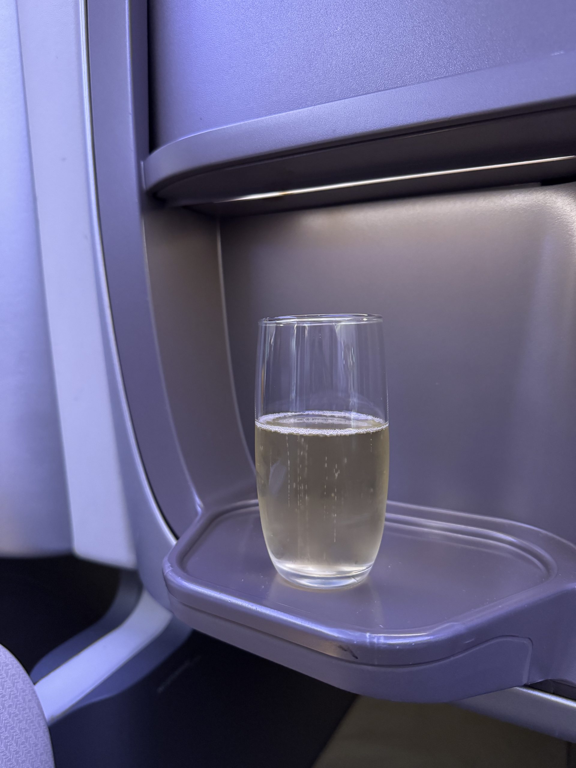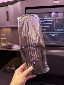 內附保濕臉部噴霧、護唇膏、護手霜,三樣簡單但實用的小物。隨後空服員開始送上迎賓飲品與熱毛巾,我在座位上邊喝香檳邊等待起飛。