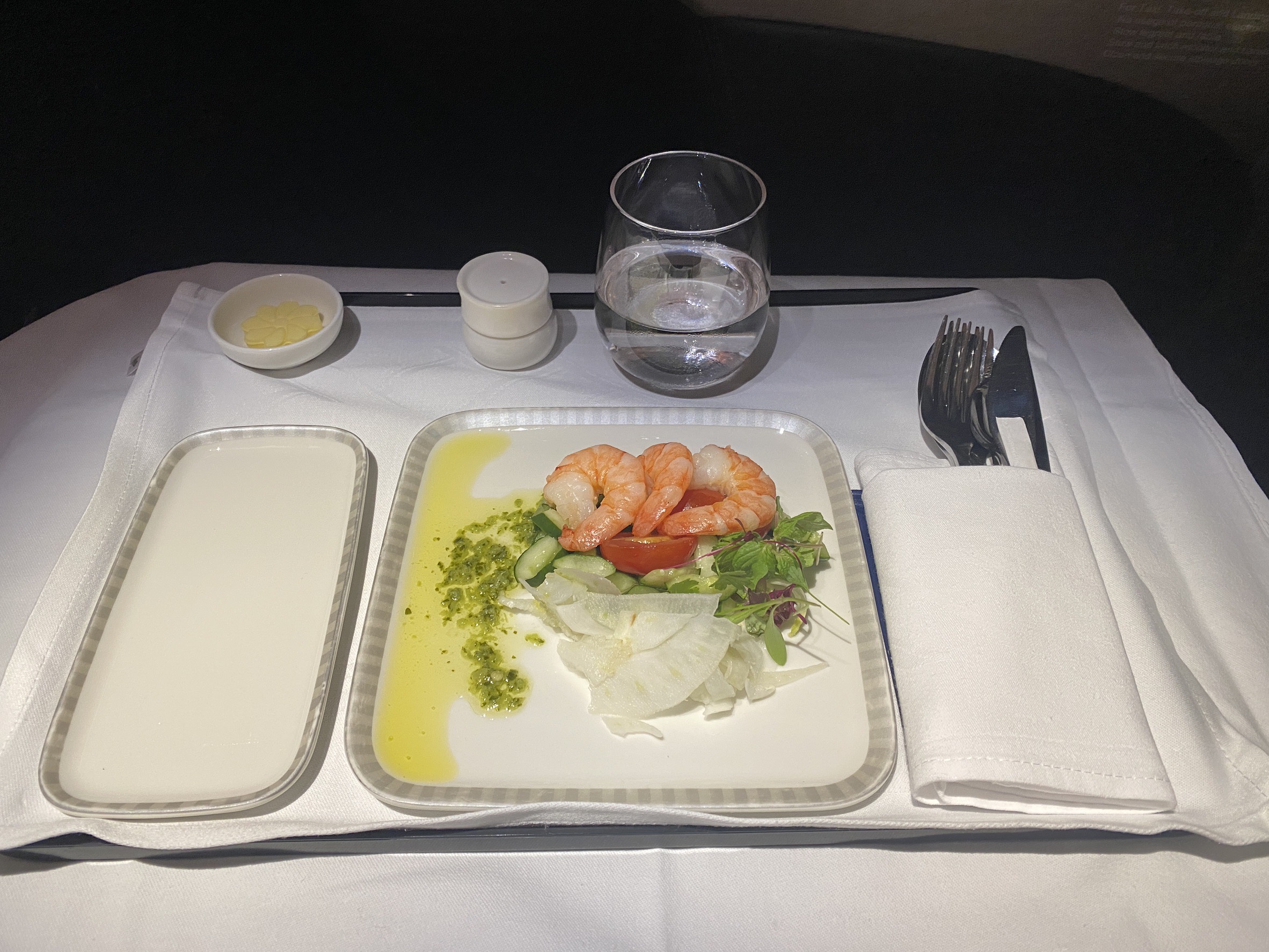豐富的菜單中包含多國料理,甚至有米其林星級名廚設計的餐點。空服員開始送上前菜,是一道鮮蝦沙拉。