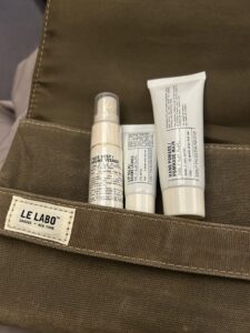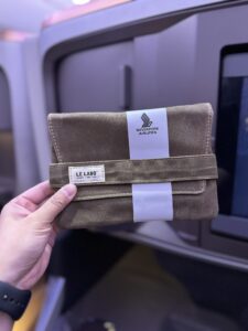 降噪耳機與礦泉水則放在旁邊的置物箱裡。我們也向空服員索取了今年新推出的 Le Labo 聯名過夜包,