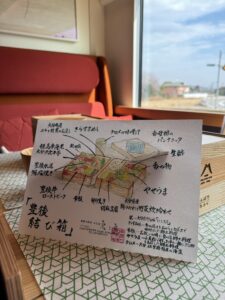 有煎魚、胡麻豆腐、豐後牛、玉子燒,甚至還有一小杯甜點。最吸引我目光的,是那張隨盒附上的手繪風格菜單。