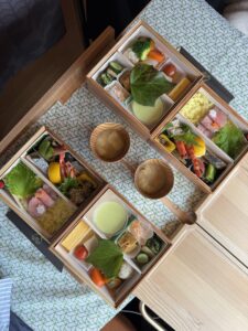 送上今日限定的便當——由大分縣餐廳設計的「豐後結び箱」。這份便當裝在大分縣產的杉木重箱中,內裝像是小型懷石料理,