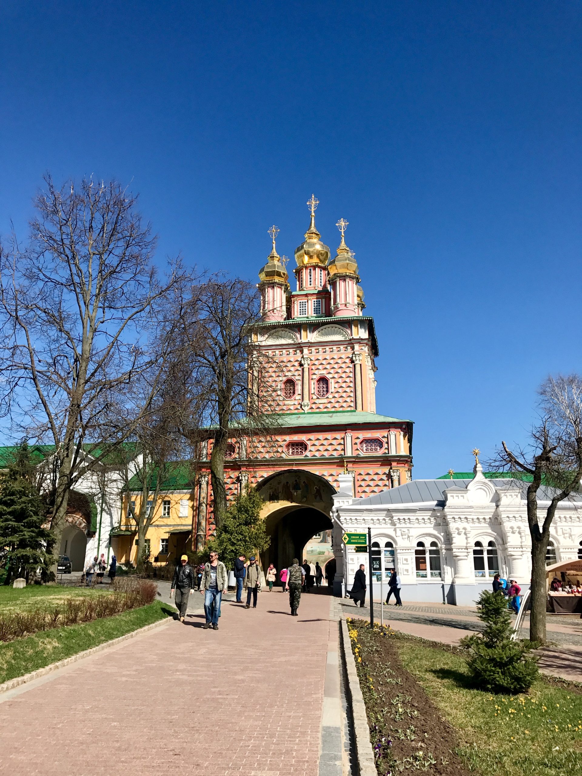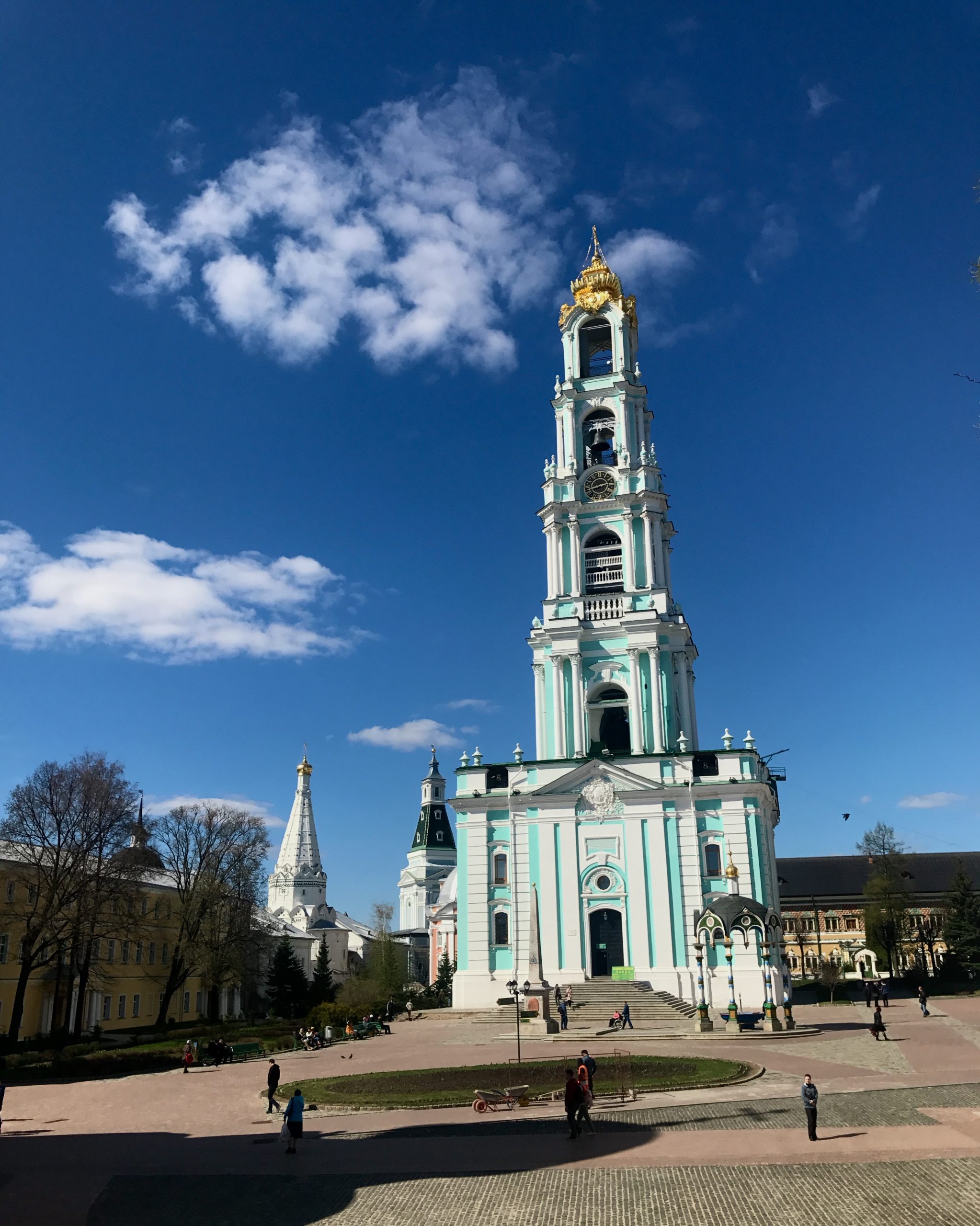 這邊周圍原來是森林,因為修道士與信徒不斷湧入,最終發展成今日的謝爾吉耶夫鎮。整個修道院區以金色、藍色與粉色交織的洋蔥圓頂構成,在藍天下閃閃發光。