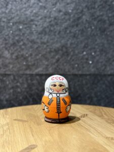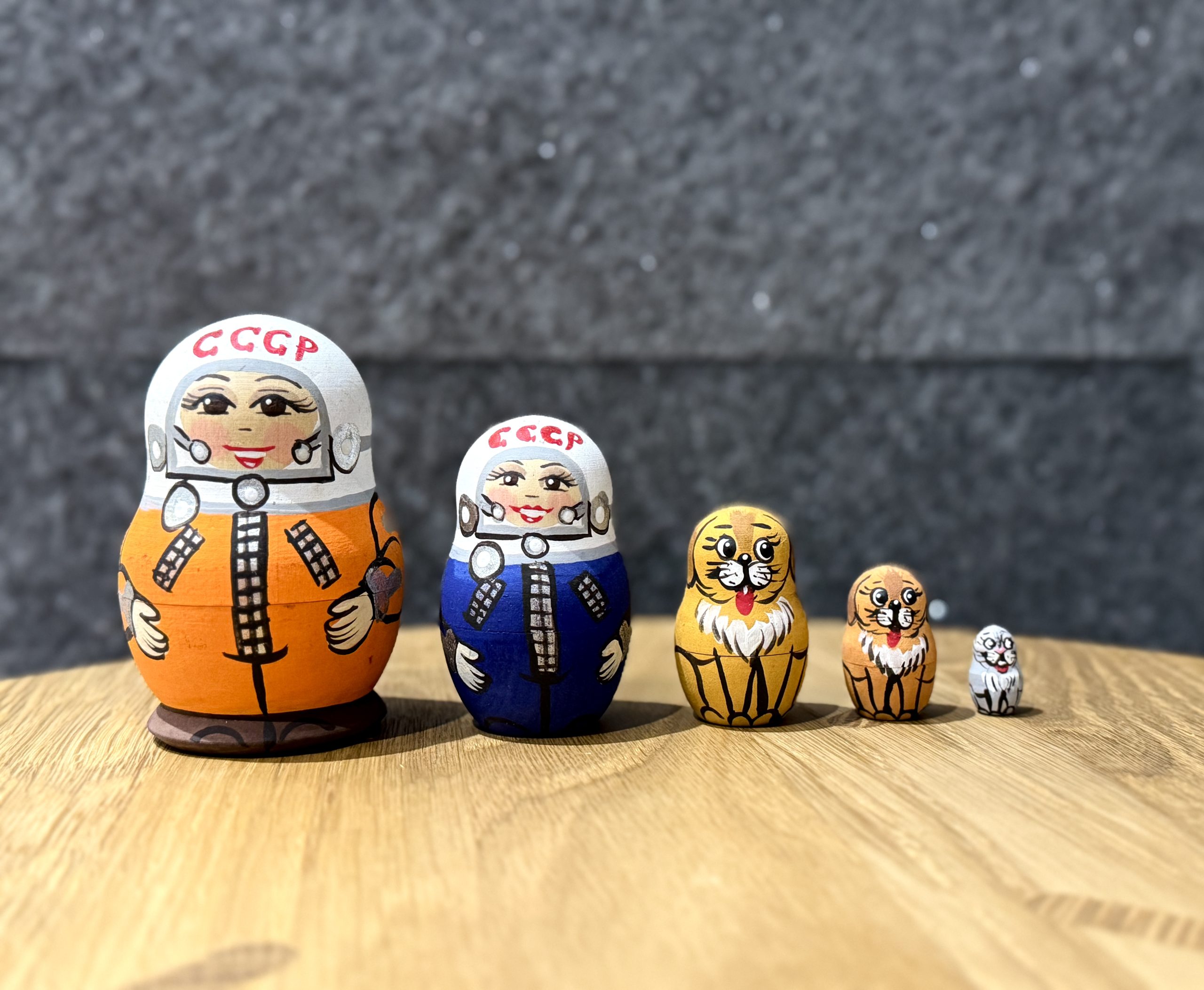 前兩層看起來是有睫毛版本的加加林,最裡面有三隻太空狗狗。