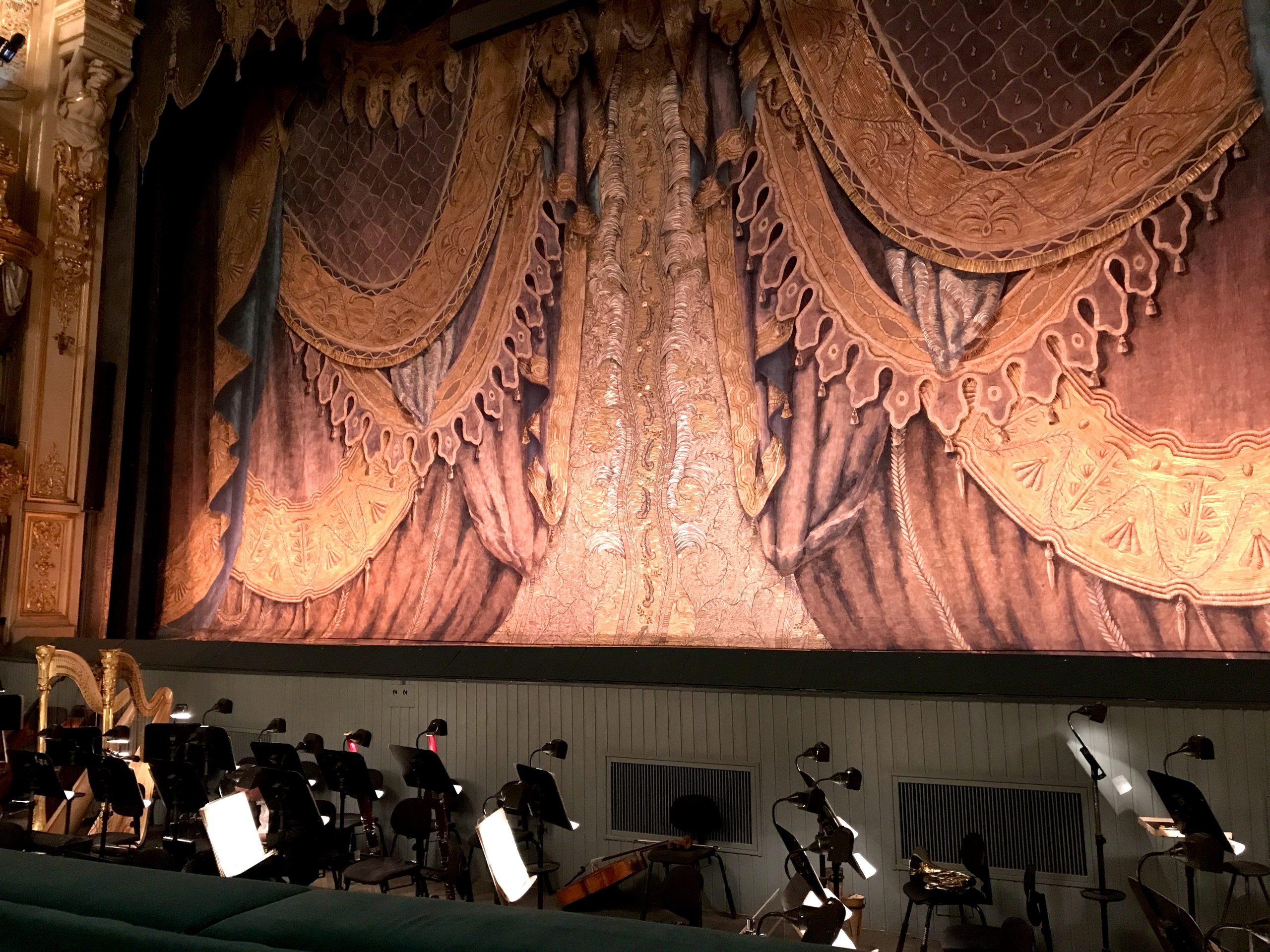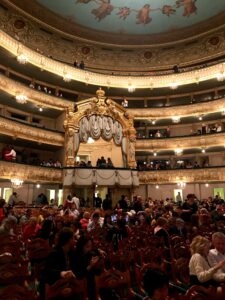 那一刻我懂了—— 在這裡看表演,要跟著馬林斯基的節奏。整座劇場是馬蹄形的經典設計,一層層包廂像階梯一樣往上堆疊,