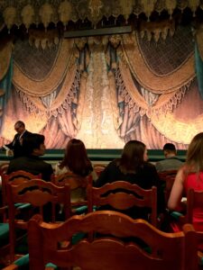 每一排的欄杆上都雕著金色裝飾,綠色絲絨座椅與厚重的簾幕則展現出濃濃的歷史感。