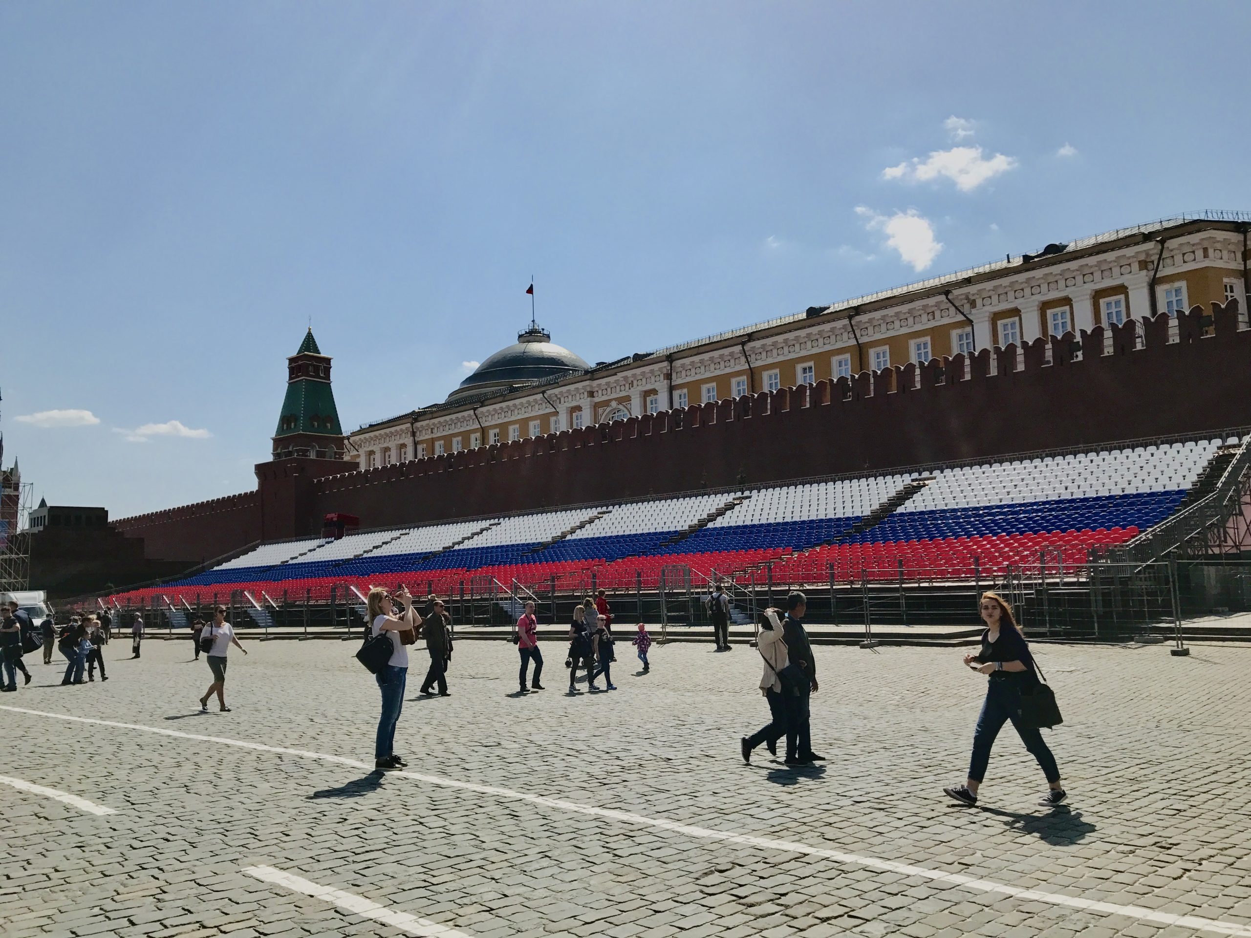 紅場周圍搭建起舞台,椅子鋪成三色國旗的樣子。不只莫斯科,聖彼得堡也染上了同樣的節日色彩。