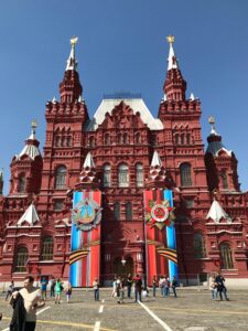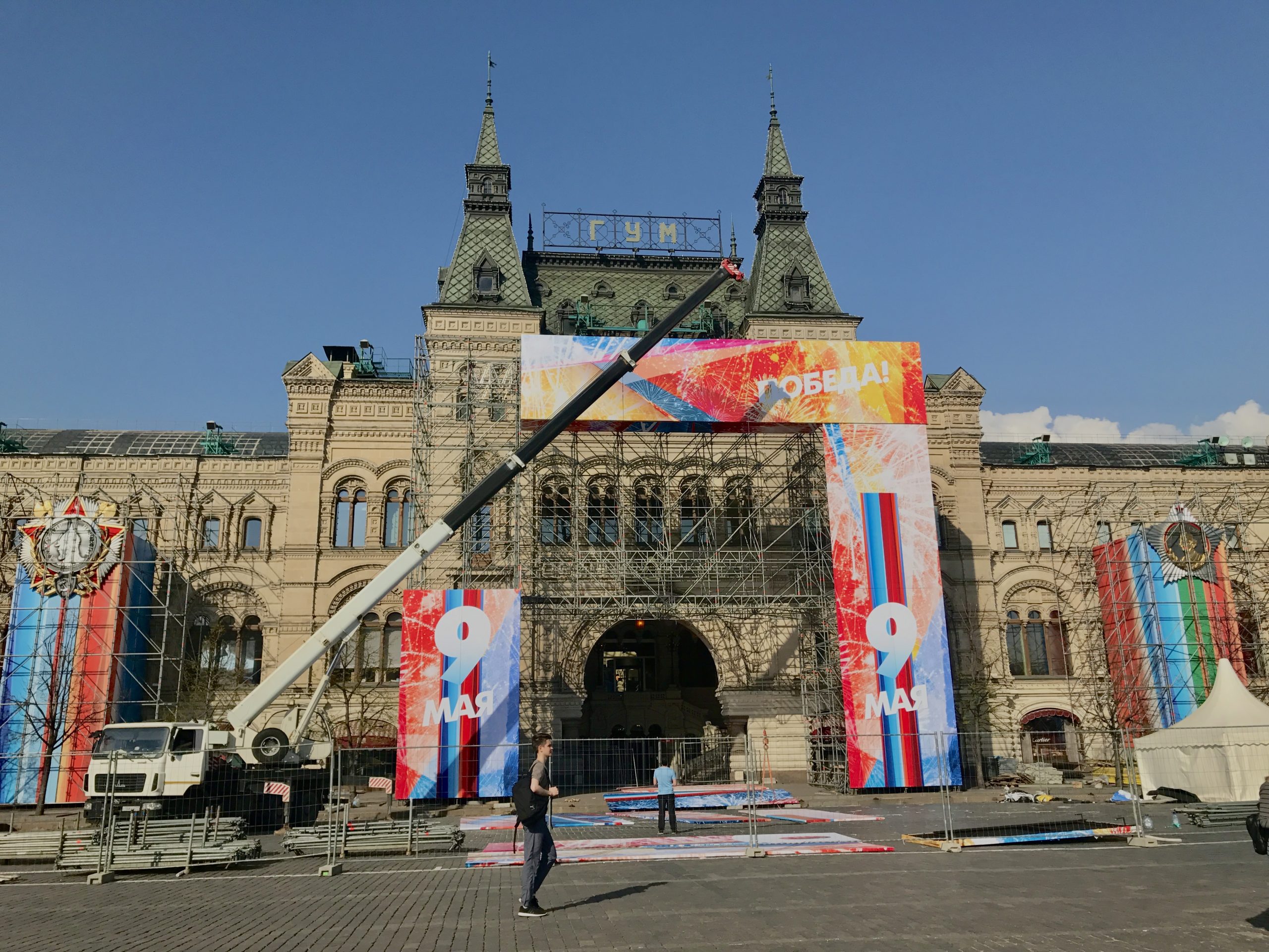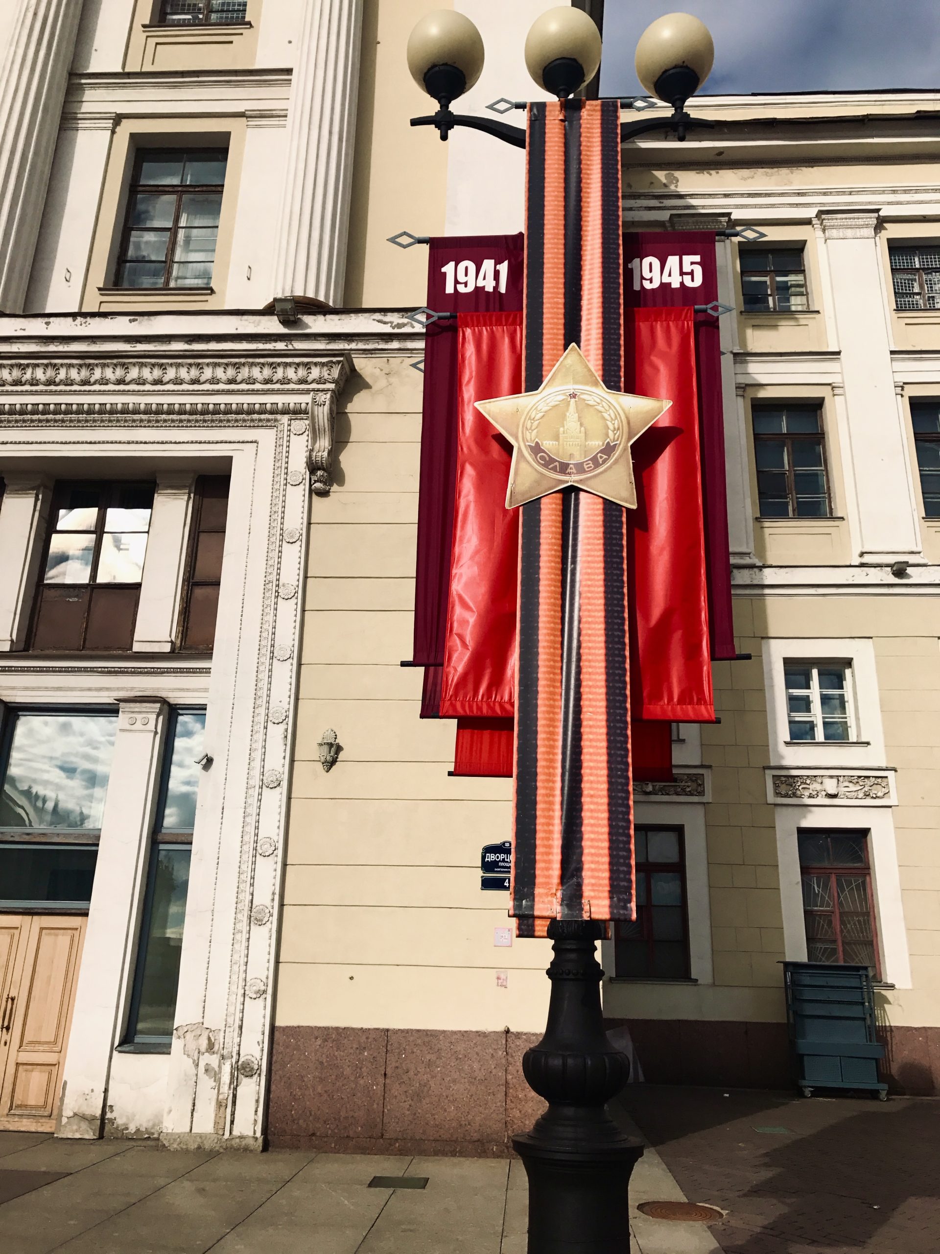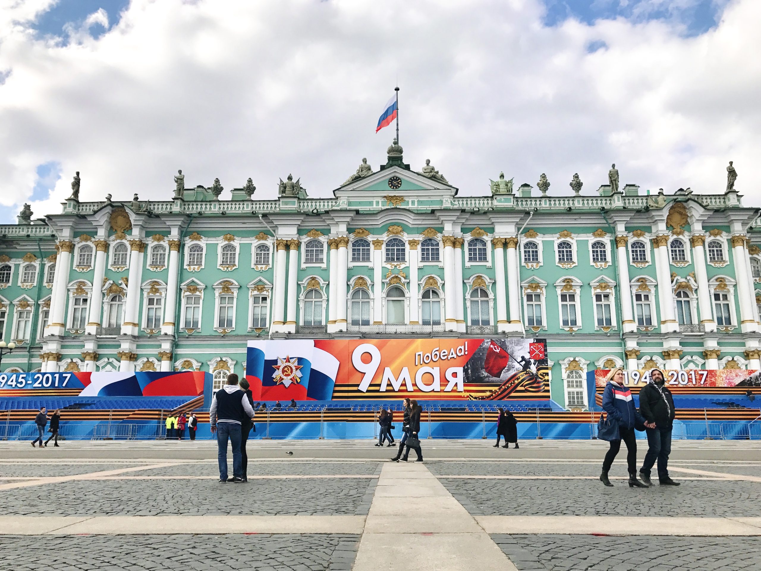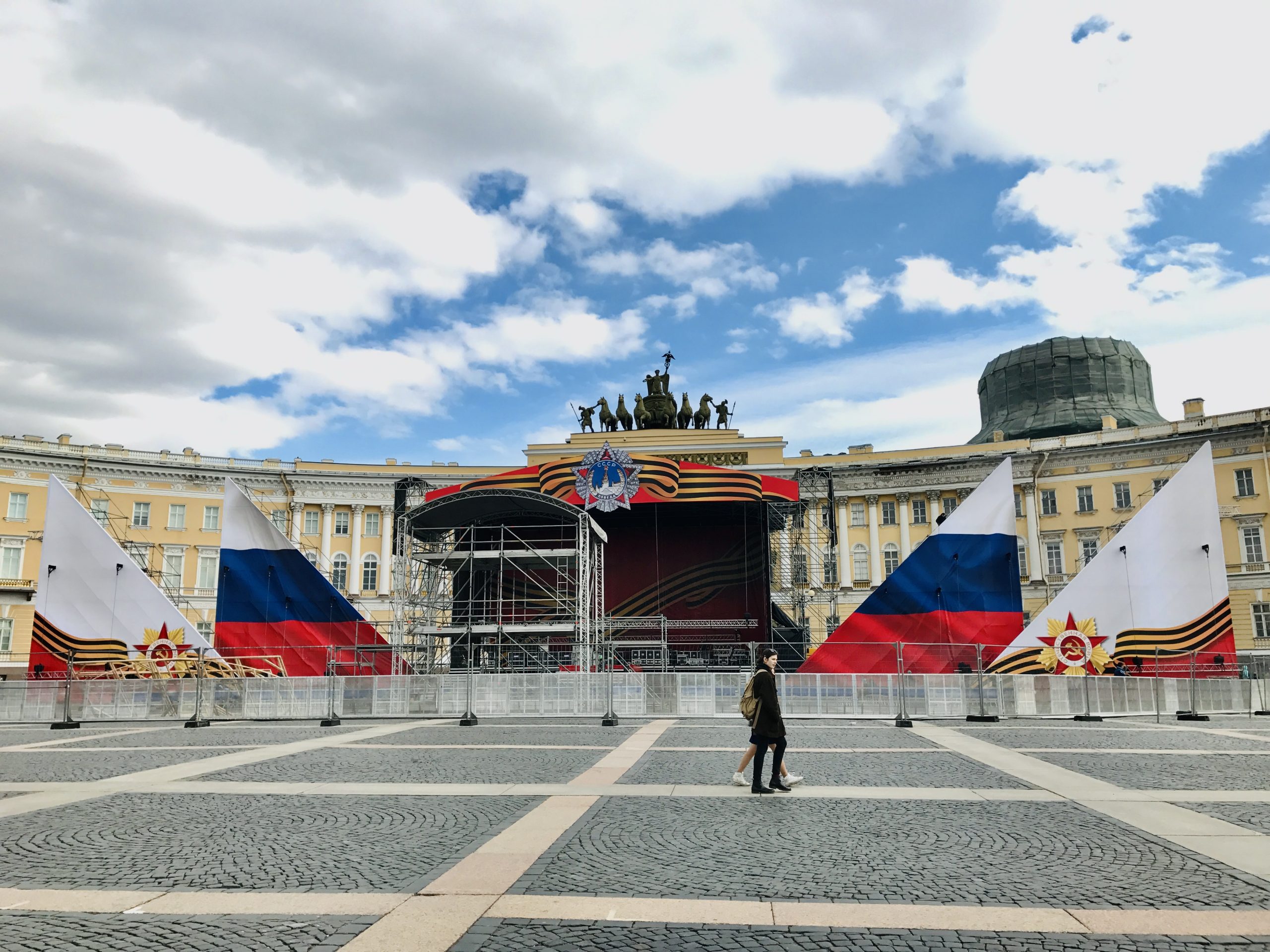 抵達冬宮那天,廣場前正搭建著一整面寫著「9 МАЯ」的舞台,