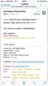 收到一封「DHL tracking number is」的信件,和一個來自莫斯科的英文名字。